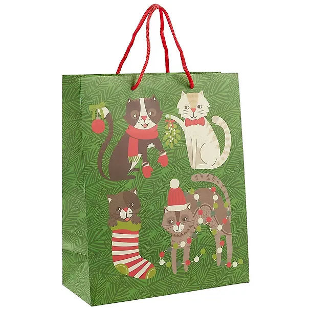 Пакет «Новогодние коты» сделан из плотной бумаги и украшен милым принтом в виде котиков в новогодних нарядах. Пакет отлично подойдёт для упаковки новогоднего подарка.
