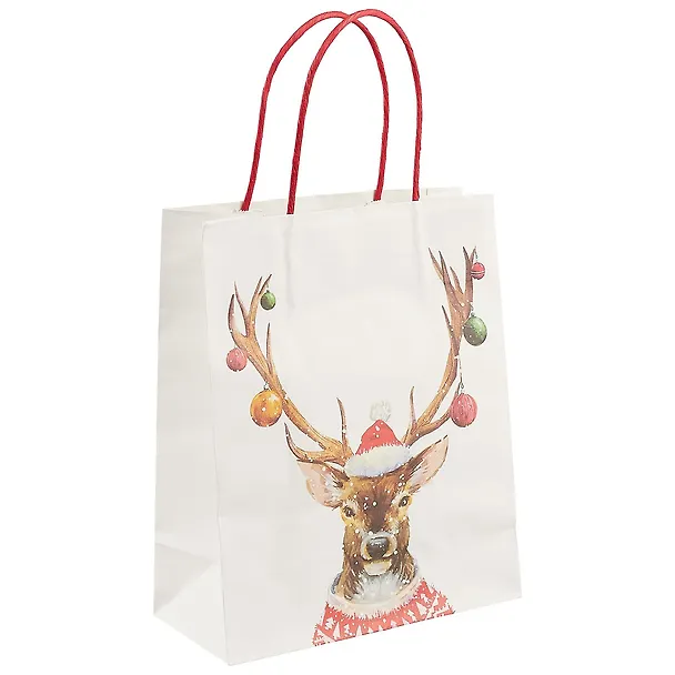 Пакет «Новогодний олень» украшает олень, который нарядился в свитер и повесил на рога яркие шарики. Только посмотрите, какая прелесть!