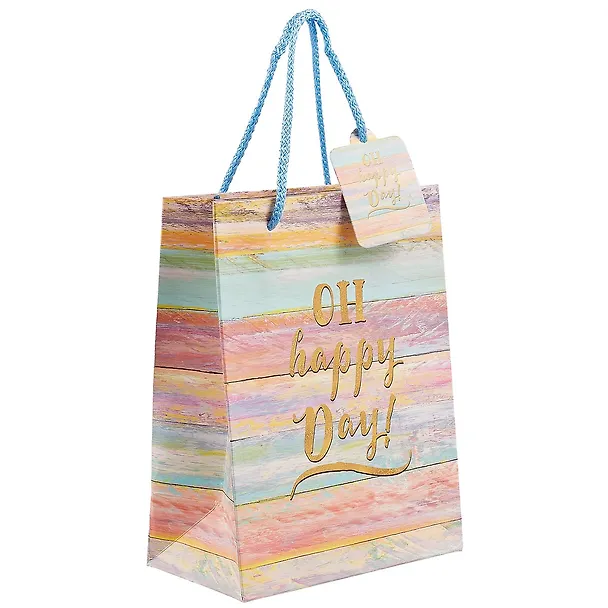 Очень симпатичный пакет, как будто раскрашен пастелью. А надпись сверху так особенно радует) Пакет достаточно вместительный и плотный, может поместиться много всего, если дарите не один подарок, либо же один большой. Очень удобные ручки, ничего нигде не отклеивается и не рвется, так что однозначно советую к покупке! Могу поставить только 5 звезд!