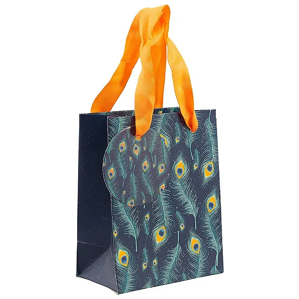 Пакет «Павлин» сделан из плотной бумаги и украшен принтом в виде павлиньих перьев с блёстками. Такой пакет подойдёт для подарка стильной имениннице.