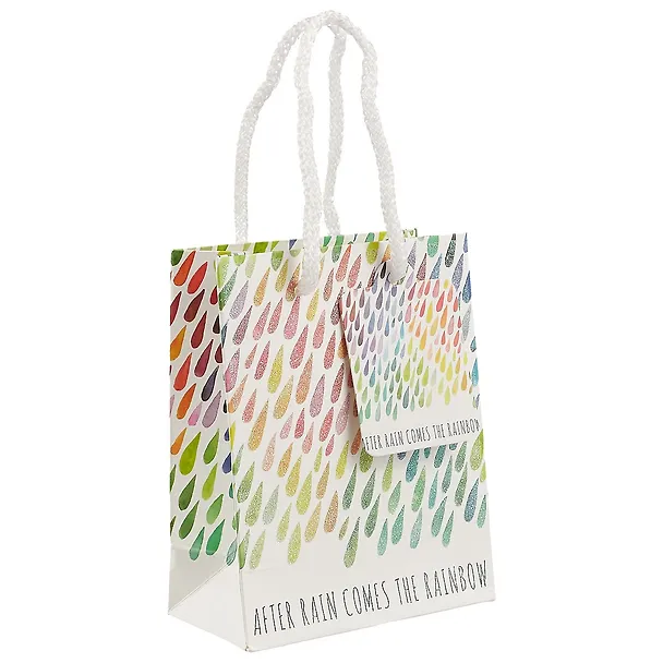 Пакет «Радужные капельки» сделан из плотной бумаги белого цвета и украшен разноцветными каплями.