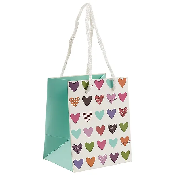 Пакет «Яркие сердечки» сделан из плотной бумаги и украшен принтом с разноцветными сердечками. Такой пакет подойдёт для упаковки подарка имениннице любого возраста.