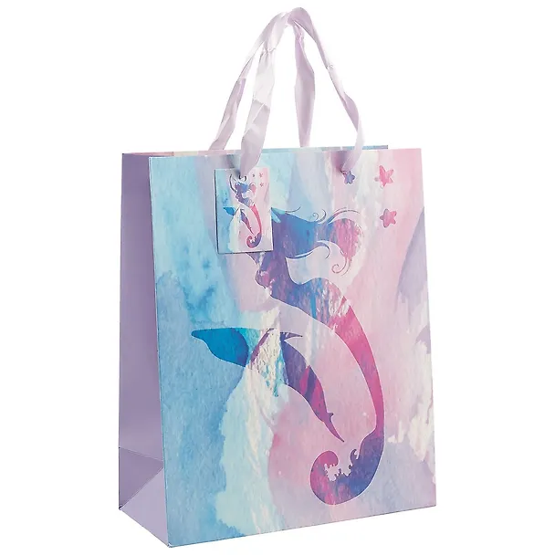 Пакет «Силуэт русалки» сделан из плотной бумаги и украшен изображением прекрасной русалки. Такой пакет подойдёт для упаковки подарка имениннице любого возраста.