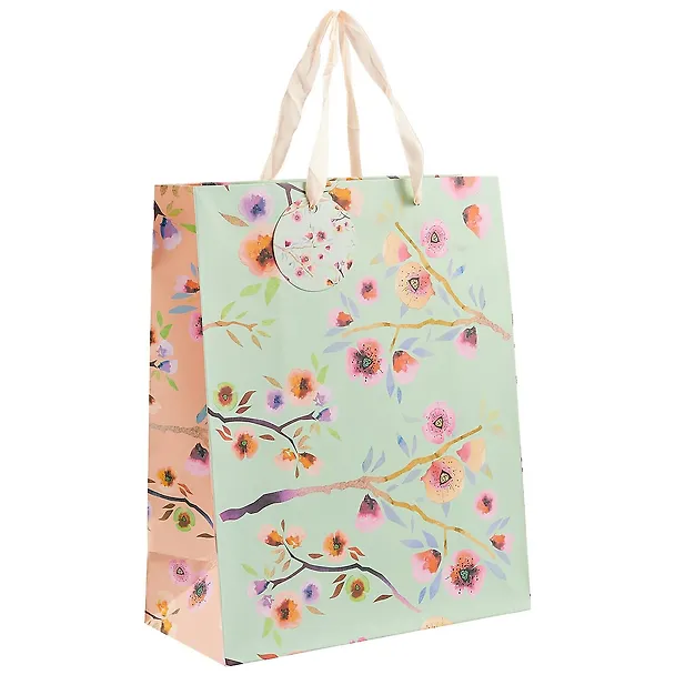 Пакет «Весенние цветы» сделан из плотной бумаги и украшен нежным принтом в виде нежных цветов и веточек. Пакет отлично подойдёт для упаковки подарка имениннице любого возраста.