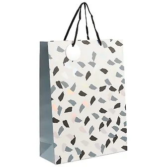Пакет «Пятнышки» сделан из плотной бумаги и украшен принтом в виде чёрных и серых пятнышек. Такой пакет подойдёт для упаковки подарка имениннику любого возраста.