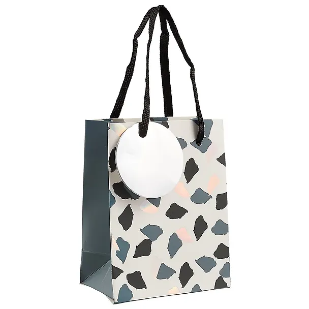 Пакет «Серые пятнышки» сделан из плотной белой бумаги и украшен серыми милыми кляксами. Он отлично подойдёт для упаковки подарка имениннику любого возраста.