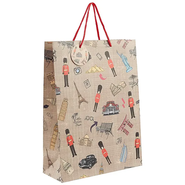Пакет «Путешествия» сделан из плотной бумаги и украшен принтом в виде символов разных городов и стран. Такой пакет подойдёт для упаковки подарка туристу любого возраста.
