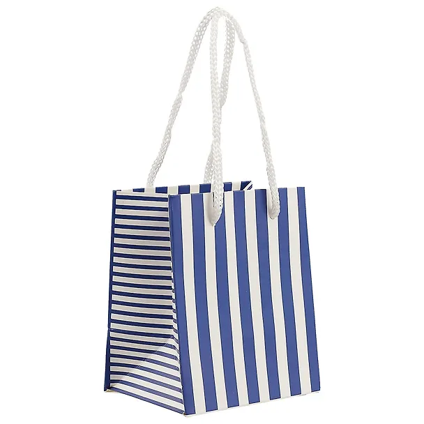 Пакет «Вертикальные полосы» сделан из плотной бумаги с синими и белыми полосами. Он отлично подойдёт для упаковки подарка именинника любого возраста.