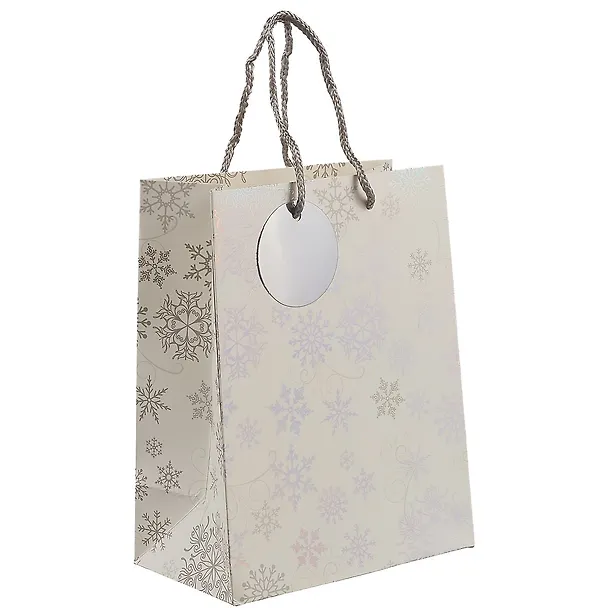 Пакет «Серебряные снежинки» сделан из плотной белой бумаги и украшен серебристыми снежинками. Он отлично подойдёт для упаковки новогоднего подарка.