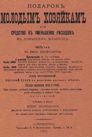Елена Молоховец «Подарок молодым хозяйкам, или средство к уменьшению расходов в домашнем хозяйстве. Часть I и II» и выбрать удобный способ его получения: самовывоз, доставка курьером