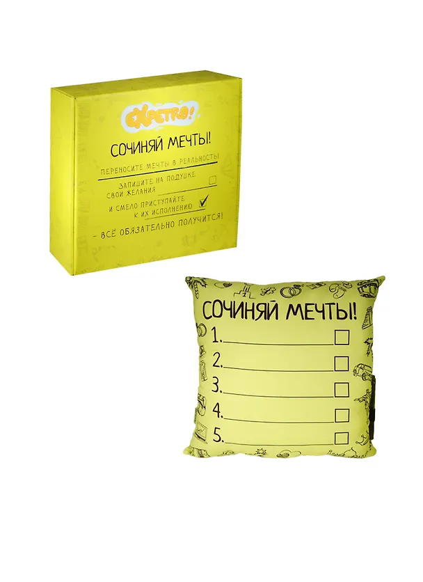Волшебная подушка сделает дом уютнее и поможет вам в исполнении самых сокровенных желаний. Просто запишите маркером на подушке свою мечту и поставьте рядом галочку, когда она исполнится. Визуализация желаний поможет сосредоточится на их исполнении. Конечно, реализация мечты в основном будет зависеть от вас. Но и в самой подушечке есть кусочек волшебства. Мы сами его туда вложили. После того, как все поля для желаний будут заполнены, вы сможете постирать подушку и заново перенести в реальность все свои мечты.