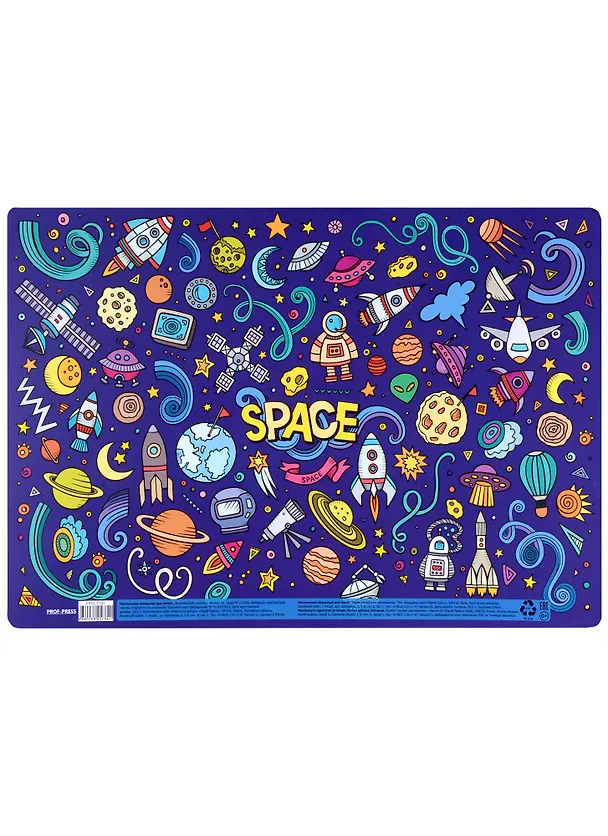 Покрытие имеет формат А3, хорошо изготовлен, достаточно прочен, при использовании не скользит на поверхности стола, отлично справляется со своей основной задачей - теперь рабочий стол ребенка в чистоте и порядке.