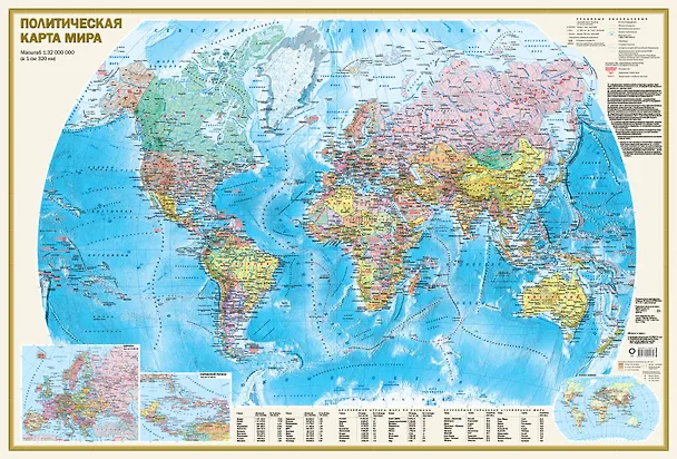 На Политической карте масштаба 1:32 000 000 (в 1 см 320 км) представлены все независимые государства мира (Россия дана в новых границах), а также зависимые территории и территории с особым статусом. Хорошо различимыми пунсонами показаны населённые пункты с градациями "более 1 млн жителей", "от 100 тыс. до 1 млн жителей" и "менее 100 тыс. жителей". Отражены основные железнодорожные и автомобильные пути сообщения. Морские пути даны с указанием километража. Главную карту дополняют врезки в более крупных масштабах на Европу и Карибский регион, а также карта "Плотность населения". В табличном виде приведены данные о крупнейших странах мира по населению, площади, а также об основных городских агло