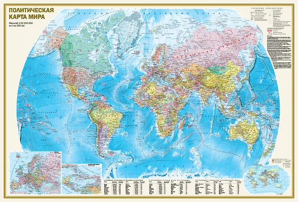 Двухсторонняя настенная карта размерами 1170х790 мм состоит из двух карт масштаба 1:32 000 000 (в 1 см 320 км). На физической карте мира благодаря удачно подобранной цветовой шкале высот и глубин с множеством градаций наглядно показан рельеф суши Земли и дна Мирового океана. Подробно отражена гидрологическая сеть материков. Приведены названия всех основных морфоструктурных форм земной поверхности (горных систем и хребтов, равнин, низменностей и пр.). Основная карта дополнена врезками на Арктику и Антарктиду, а также картами "Климатические пояса" и "Природные зоны суши". На Политической карте представлены все независимые государства мира, а также владения и территории с особым статусом. Росси