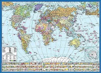 Политическая карта мира отпечатана на плотном картоне с глянцевой двусторонней ламинацией. Содержит изображения гербов и флагов. Карта может использоваться как справочно-информационное и учебное пособие. Углы карты закруглены. Масштаб: 1:58 млн.