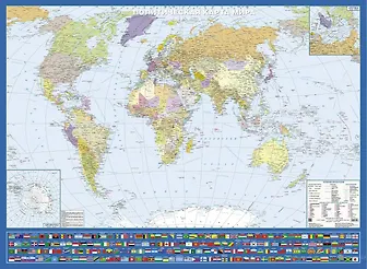 Политическая карта мира с флагами, Крым в составе РФ (на картоне с матовой ламинацией) В нижней части карты даны флаги государств мира. Масштаб карты 1:26 000 000 Формат 1 325 х 970 мм. Карта может использоваться справочно-информационное и учебное пособие.