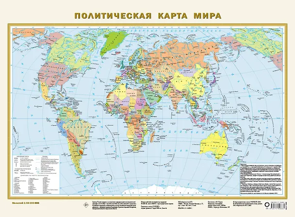 Политическая карта мира имеет размеры 575х420 мм и с лицевой стороны покрыта полимерной плёнкой. На карте масштаба 1:58 000 000 (в 1 см 580 км) яркими контрастными цветами показаны все независимые государства мира с их столицами, а также владения и территории с особым статусом. Россия представлена в новых границах: с Донецкой и Луганской Народными республиками, Запорожской и Херсонской областями, Республикой Крым и Севастополем. Населённые пункты на карте даны в трёх градациях численности: более 1 млн жителей, от 100 тыс. до 1 млн, менее 100 тыс. жителей. Карта упакована в прозрачный рукав из ПВХ. Размеры упаковки: длина 420 мм, диаметр 45 мм