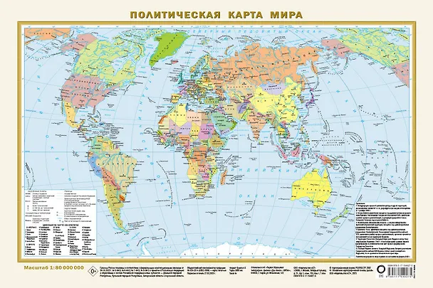 Эта карта формата А3 имеет размеры 440х290 мм и с лицевой стороны покрыта полимерной плёнкой. На Политической карте мира в масштабе 1:80 000 000 (в 1 см 800 км) показаны все независимые государства мира с их столицами, а также владения и территории с особым статусом. Российская Федерация представлена в новых границах, включая Республику Крым, Севастополь, ДНР, ЛНР, Запорожскую и Херсонскую области. Населённые пункты на карте даны в трёх градациях численности: более 1 млн жителей, от 100 тыс. до 1 млн, менее 100 тыс. жителей. Карта упакована в прозрачный рукав из ПВХ длиной 290 мм и диаметром 40 мм. Рекомендовано для широкого круга пользователей.