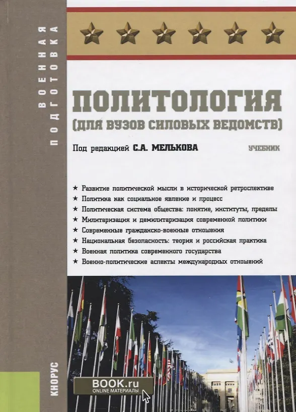 Рассмотрены важнейшие политологические понятия и вопросы общетеоретического характера, выражающиеся в исследовании понятия "политическое" как явления, исторической ретроспективы развития политической мысли, политической и государственной власти, политической системы общества. Особое место уделено изучению проблем милитаризации (демилитаризации) современной политики, современных гражданско-военных отношений, национальной безопасности, доктринального измерения военной политики современного государства, военной силы в международных отношениях. Прикладная часть учебника базируется на авторских учебных кейсах. Все темы учебника сопровождаются вопросами для самоконтроля, практическими заданиями, т