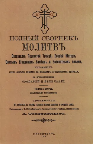 Вашему вниманию предлагается "Полный сборникъ молитвъ читаемыхъ перед святыми иконами на молебнахъ и всенощныхъ бденияхъ, с присоединенiемъ тропарей и величанiй", составитель Ставровский А., репринтное издание 1914 года.
