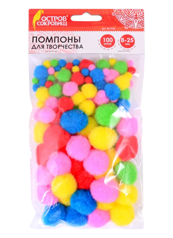 Помпоны для творчества ассорти (5 цв) (8 мм/15 мм/25 мм) (100шт) (661436) (3+) (упаковка) (Остров сокровищ)