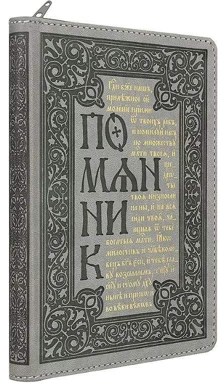 Помянник малого формата в переплете из искусственной кожи на молнии с блинтовым тиснением и с тиснением золотой фольгой. Использована качественная офсетная бумага со скругленными углами, золотой обрез блока. Форзац выполнен из дизайнерской бумаги.