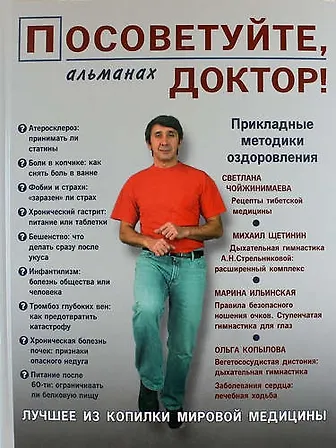 Альманах "Посоветуйте, доктор!" подготовлен по материалам одноименной передачи Радио России. В этот выпуск вошли прикладные методики оздоровления от российских врачей: рецепты тибетской медицины от Заслуженного врача Бурятии, главного врача клиники "Наран" Светланы Чойжинимаевой; расширенный комплекс дыхательной гимнастики А.Н.Стрельниковой от ее ученика Михаила Щетинина; рекомендации главного врача Центра эффективной офтальмологии Марины Ильинской "Правила безопасного ношения очков. Ступенчатая гимнастика для глаз"; дыхательная гимнастика для больных вегето-сосудистой дистонией; рекомендации по технике лечебной ходьбы при сердечно-сосудистых заболеваниях. В альманахе опубликованы беседы с в
