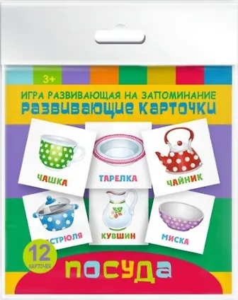 Серия развивающих игр на запоминание «Развивающие карточки» (3+) Занятия с карточками развивают у ребёнка интеллект, зрительную память, помогают научиться быстро запоминать названия предметов и написание слов. С наборами развивающих карточек ребёнок не только освоит названия цветов, форм, морских жителей, времён года, профессий, видов спорта, но и научится их различать и узнавать, а также запомнит основы безопасного поведения дома и на улице. Индивидуальная ПЭТ-упаковка.