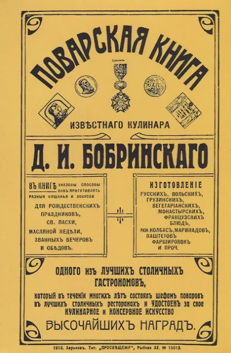 ."Поварская книга известного кулинара Д.И. Бобринского, одного из лучших столичных гастрономов, который в течение многих лет состоял шефом поваром в лучших столичных ресторанах и удостоен за свое кулинарное и консервное искусство высочайших наград. В книге указаны способы как приготовлять разные кушанья и закуски для Рождественских праздников, Св. Пасхи, Масляной недели, званных вечеров и обедов. Изготовление русских, польских, грузинских, вегетарианских, монастырских, французских блюд, разных колбас, маринадов, паштетов, фаршировок и проч."