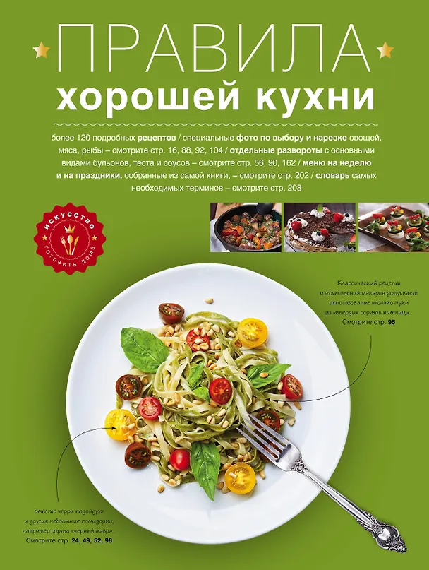 Книга наполнена информацией, как текстовой так и иллюстративной, пошаговой. Какая нужна посуда и инвентарь? Показаны варианты нарезки овощей. Как выбирать и разделывать мясо, птицу, рыбу? Все проиллюстрировано. Дан важный раздел о необходимых специях и приправах и в какие блюда что лучше добавлять. Оглавление в начале книги дает ориентацию, где и что найти. Алфавитный указатель продуктов