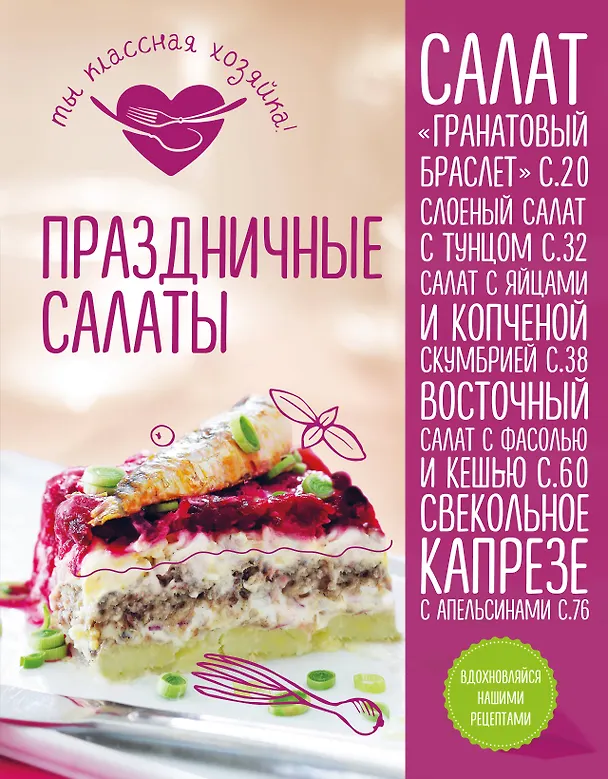 Праздничные салаты. Чудесная книга! Татьяна сотникова собрала оригинальные салаты, я даже не думала, что это можно есть и вкусно. И разного уровня- есть простые, а есть сложные, слоеные даже. Такие классные - капрезе и восточный меня и моих домашний привели в восторг. Издано тоже красиво, настраивает...
