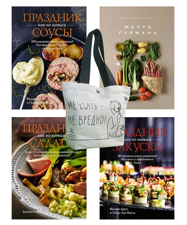 Замечательно скомпонованный комплект книг, который можно использовать в качестве подарка. А прилагаемый шопер, может служить не стандартной подарочной упаковкой. В каждой книге есть своя изюминка. Книга "Мечта гурмана" наполнена разнообразными рецептами, особенно заинтриговал суп из топинамбура. Три других книги из серии "Праздник как по нотам": "Салаты", "Закуски", "Соусы" -  предлагают большое количество вариантов салатов, закусок и соусов к блюдам. У меня, к сожалению, есть пока что только одна книга из этого комплекта, посвященная соусам. Это настоящая фиерия вкуса, позволяющая из привычных продуктов сделать изюминку, которая обогащает, как повседневное, так и праздничное меню. Обязательно пополню свою библиотеку остльными книгами.