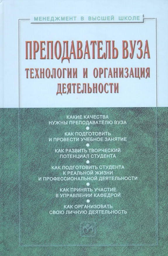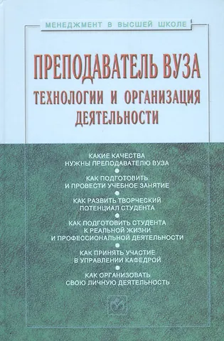 Рассмотрены технологии и организация деятельности преподавателя высшего учебного заведения. Особое внимание уделено подготовке и проведению учебного занятия, организации научно-исследовательской и воспитательной работы среди студенчества, самооценке личной деятельности преподавателя. Книга задумана как составная часть серии учебников "Менеджмент в высшей школе", комплексно охватывающих объекты и субъекты управления в вузе: "Студент вуза", "Преподаватель вуза", "Управление кафедрой", "Управление факультетом", "Управление высшим учебным заведением". Для преподавателей вузов, а также для студентов, получающих дополнительную квалификацию "Преподаватель высшего учебного заведения", для заведующих