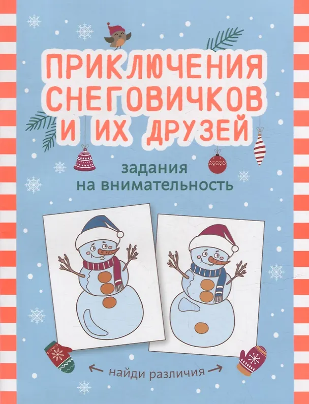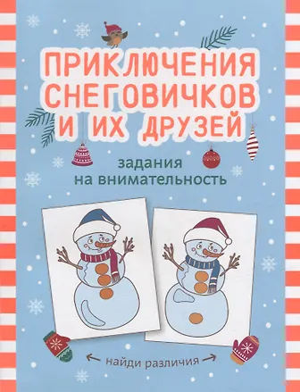 Весёлые снеговички и их друзья готовятся к Новому году. Столько всего надо успеть: позвать гостей, приготовить вкусные кушанья, принести ёлку из леса и нарядить её, упаковать подарки, а ещё покататься с ледовой горки на санках и ватрушках. Недобрая колдунья хочет помешать празднику и всё время пытается запутать снеговичков. Чтобы помочь им, внимательно смотри на рисунки, ищи спрятанные предметы, лишние картинки и находи различия между изображениями. Где-то будет 5 различий, где-то 7, а где-то целых 10! Справишься?