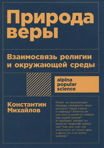 "Природа веры" Константина Михайлова это познавательный научпоп о прямой зависимости условий окружающей среды и верований, а также мироощущения, формирующихся у людей. Книга написана не без юмора, будет интересна в основном неспециалистам, поскольку автор не делает революционных заявлений и открытий, да и не ставит перед собой такую задачу. В книге скорее подводится итог изучений связки религии и экологии на разных континентах. В конце каждой главы дается библиографический список всех упомянутых в тексте книг, статей и электронных ресурсов, с которыми можно ознакомиться дальше, если какая-то тема особенно заинтересовала. Автор старается увлечь читателей предметом своего изучения, и это замечательно. В главах также есть QR-коды, что привносит в чтение игровой элемент.