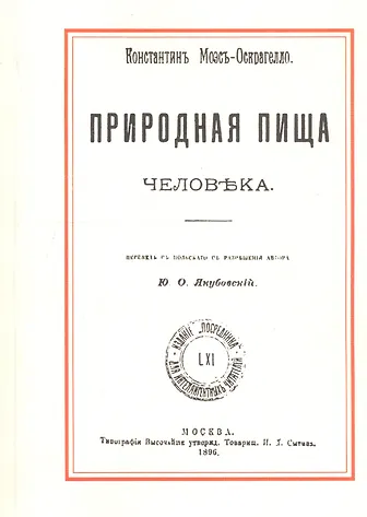 Тираж 30 экземпляров, книга изготовлена по технологии "печать по требованию". Репринт с издания. СПб. 1896. Книга из двух частей: Вегетарианство сырое (Абсолютное) и Вегетарианство варёное. Мы печатаем перевод книги Моэс-Оскрагелло, так как признаем за ней неоспоримые достоинства. Оригинальность взгляда, неопровержимость логических выводов и увлекательность изложения, и наконец, масса полезного, жизненного материала - все это заставляет нас желать этой книге самого широкого распространения. Мы охотно верим ему в том, что он уже дошел до питания себя сырыми, неразмолотыми зернами, сырыми фруктами, овощами и орехами; но он сам предупреждает читателя о том, что не следует сразу пробовать его ра