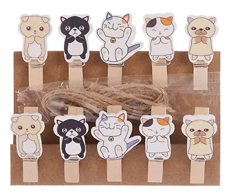 Набор декоративных прищепок «Котики» — очаровательный материал для творчества и оформления интерьера. Десять миниатюрных прищепок с изображениями котят и прилагающейся верёвкой позволяют создавать уютные гирлянды, фотоколлажи и оригинальные украшения. Изделие сочетает функциональность, эстетику и экологичность, подходит для детских и взрослых творческих проектов.