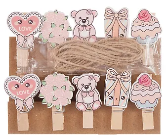 Прищепки декоративные с веревкой Праздник (10шт). Набор включает 10 прищепок и верёвку, подходит для декорирования фотоколлажей, подарков, цветочных композиций и других творческих проектов.
