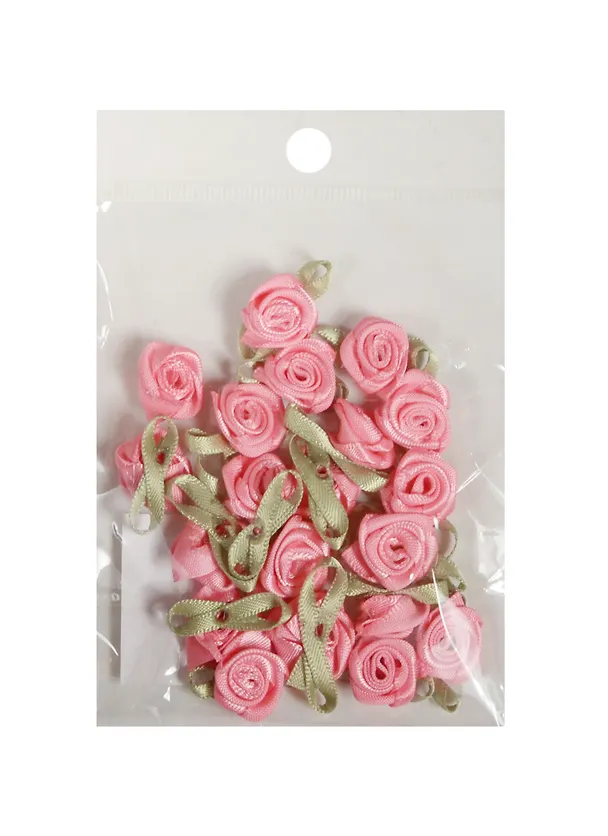 Пришивные розочки с листиками светло-розовые (1,5см)(20шт)(пакет) (11-01055-QS73-4)
