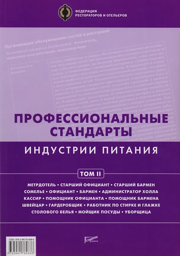 Новый переработанный справочник содержит профессиональные стандарты индустрии питания второго поколения. Профессиональные стандарты - это необходимые требования к профессиональному уровню работников с указанием их образовательного уровня и должностных обязанностей. Все документы были разработаны ведущими экспертами ресторанного рынка.