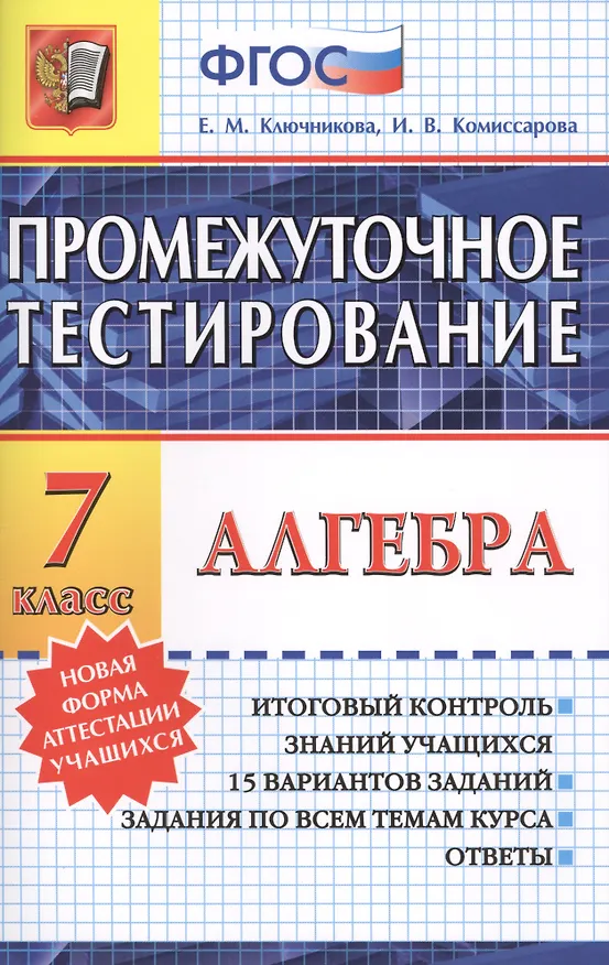 Данное пособие полностью соответствует федеральному государственному образовательному стандарту (второго поколения). Цель пособия — оказание методической помощи учителю при организации контроля компетентностей обучающихся по алгебре, сформированности у них общеучебных и предметных навыков, ученикам — при повторении изученного материала, а также для самопроверки. Пособие включает 15 вариантов заданий для проведения контроля знаний учащихся в конце учебного года и дает учителю возможность быстро провести диагностику усвоения школьниками материала 7 класса.