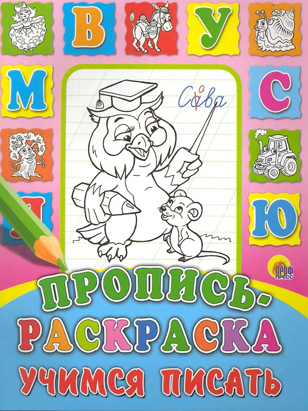 Прописи порадовали наличием как заглавных, так и прописных букв. Причем, манера написания - самая правильная и красивая - точь-в-точь как когда-то нас учили писать. Картинки, предлагаемые к раскрашиванию, небольшие, но интересные. Огорчило, что картинки сложно связаны с буквами, которые на той же страничке ребенок тренируется писать, или связаны очень отдаленно и только часть картинки. Приходится ребенку пояснять, почему, например, при тренировке написания букв "И" и "Й" на картинках изображен кот в костюме фокусника ("Иллюзионист") и волк в чалме, сидящий на коврике с гвоздями ("Йог"). В общем, родителям есть что терпеливо объяснять ребенку, просто посадить его за эти прописи - не получится.