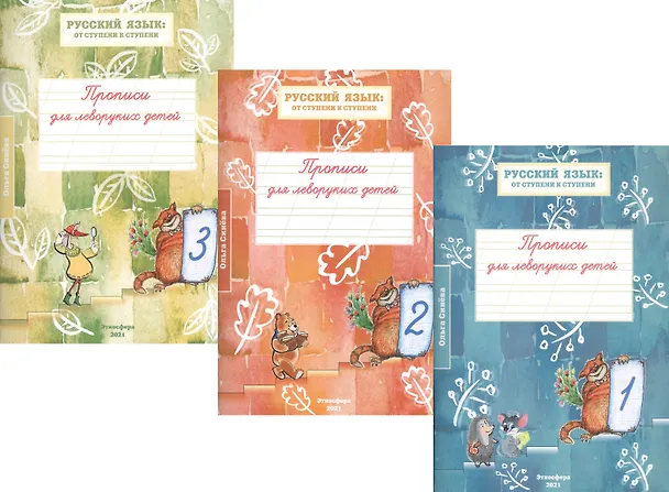 Тетради по письму (№ 1, 2, 3) для леворуких детей являются составной частью учебно-методического комплекса «Русский язык: от ступени к ступени. Произношение, чтение, письмо», который может также использоваться для обучения инофонов и билингвов. Психофизические особенности леворуких детей учитываются за счет композиционного расположения графического материала, но при этом сохраняются нормы каллиграфии (наклон графем, направление письма справа налево). В тетрадях представлена система заданий, нацеленных на формирование у учащихся графических, каллиграфических и орфографических навыков. Кроме того, дидактический материал прописей позволяет закрепить знания основ грамматики и навыки русского произношения, полученные на уроках в школе или «с родителями», а также мотивировать к освоению текстов детской литературы. Тетради содержат увлекательные иллюстрации, восполнение деталей и цвета которых способствует выработке навыков письма, а также наглядному представлению значения слова и образов русской сказки. Такой комплексный подход позволит учителям и родителям реализовать и учебную, и контролирующую функции.