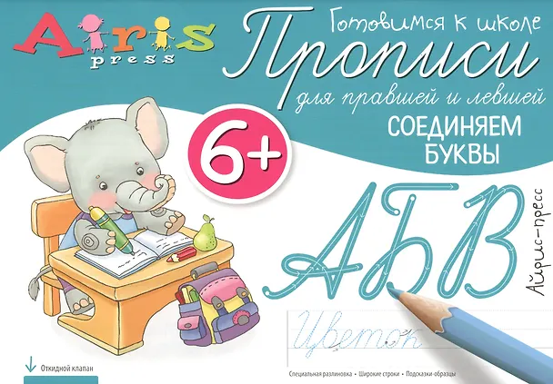 Особый раскладной клапан с образцами букв и слов удобно трансформируется. И во время письма ребёнок видит перед собой нужную информацию. Схема посадки при письме и подсказки, как лучше держать ручку, очень помогут ребёнку на первых занятиях. Взрослые оценят полезную информацию для организации занятий.