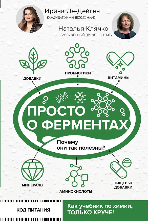 Ирина Ле-Дейген — кандидат химических наук, доцент химического факультета МГУ, победитель 3 сезона Лиги Лекторов. Наталья Клячко — доктор химических наук, профессор, заместитель директора Научно-образовательного центра по нанотехнологиям, а также известный ученый в области биохимии. Самый цитируемый молодой биохимик России и заслуженный профессор МГУ вернут вам утраченные знания по химии и дадут понять, что эта наука — не скучные формулы, а интереснейшие процессы, происходящие внутри человеческого организма и в окружающей нас среде. В книге Ирина и Наталья расскажут: • как ферменты ускоряют химическую реакцию с 32 миллиардов лет до 1 секунды; • почему бабушкин чайный гриб снова стал популярн