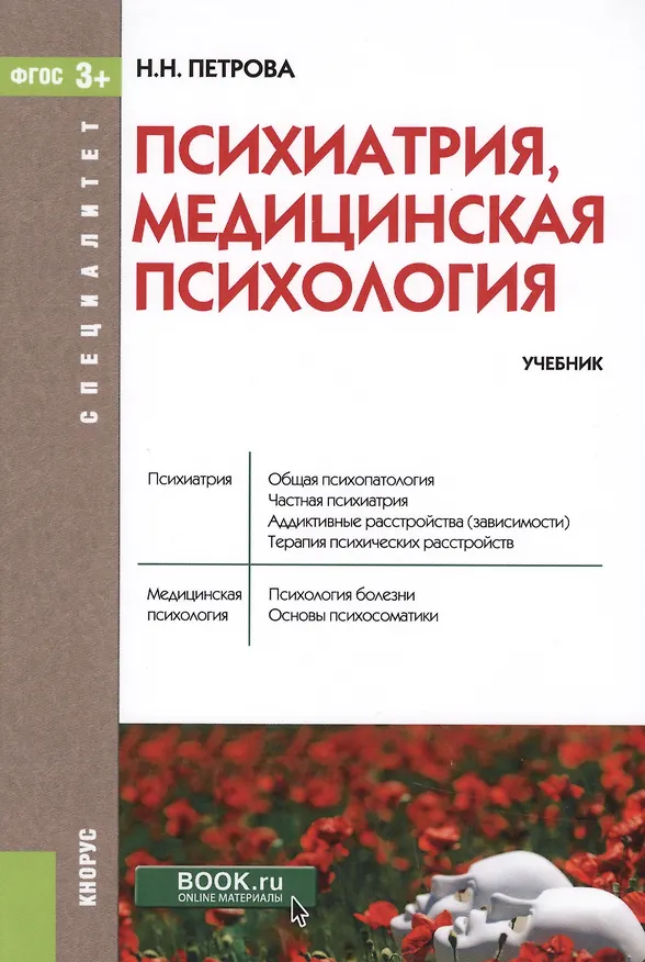 Создан в соответствии с принятой современной классификацией психических расстройств и отражает традиционные положения российской психиатрической школы. Включены основные разделы психиатрии: общая психопатология, отдельные психические расстройства, методы диагностики, терапии и реабилитации, социальные и правовые вопросы психиатрии, возрастные особенности психических расстройств, ургентные состояния. Освещены вопросы медицинской психологии, актуальные для формирования профессиональных компетенций врача. Построен по модульному принципу и предназначен для высшего медицинского образования и преподавания дисциплины "Психиатрия, медицинская психология". Соответствует ФГОС ВО 3+. Для высшего профес