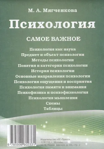 В шпаргалку включены разделы: Психология как наука; Предмет и объект психологии; Методы психологии; Понятия и категории психологии; Основные направления психологии; Психология ощущения и восприятия; Психология памяти и внимания; Психофизика и психофизиология; Психология мышления; Схемы, таблицы.