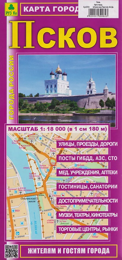 Двусторонняя полноцветная карта. Содержит подробный план города со всеми улицами, номерами угловых домов. Указано расположение административных зданий и социально-культурных объектов. Имеется указатель улиц. Масштаб г. Псков 1:18 000. Указано расположение постов ГИБДД, автозаправочных станций, гостиниц. Формат 495 х 695 мм