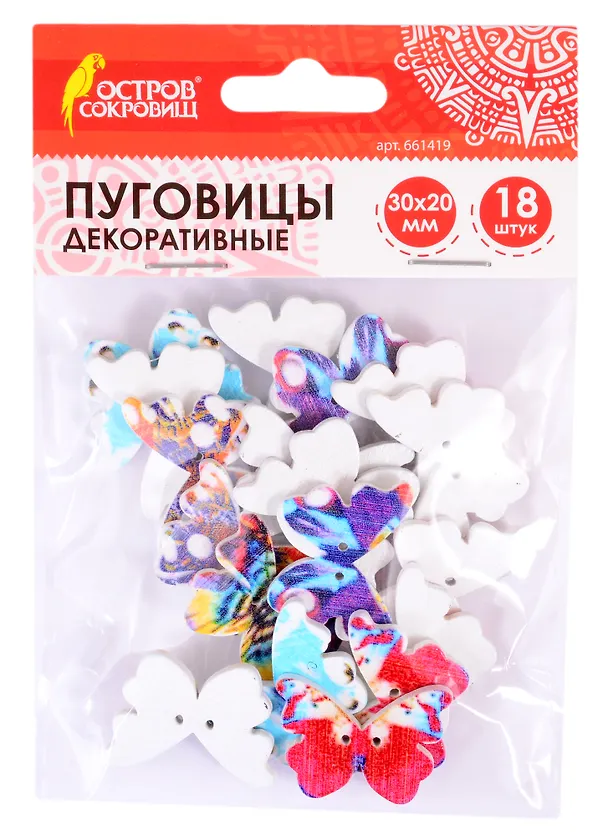 Пуговицы декоративные Бабочки (30х20 мм) (18 шт) (661419) (3+) (дерево) (упаковка) (Остров сокровищ)