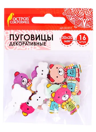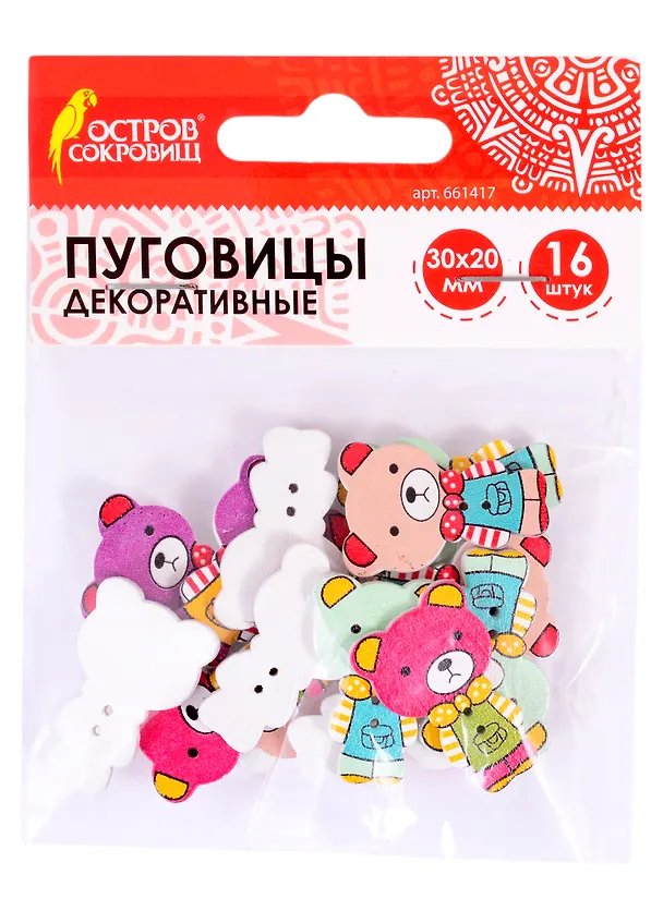 Пуговицы декоративные Мишки (30х20 мм) (16 шт) (661417) (3+) (дерево) (упаковка) (Остров сокровищ)